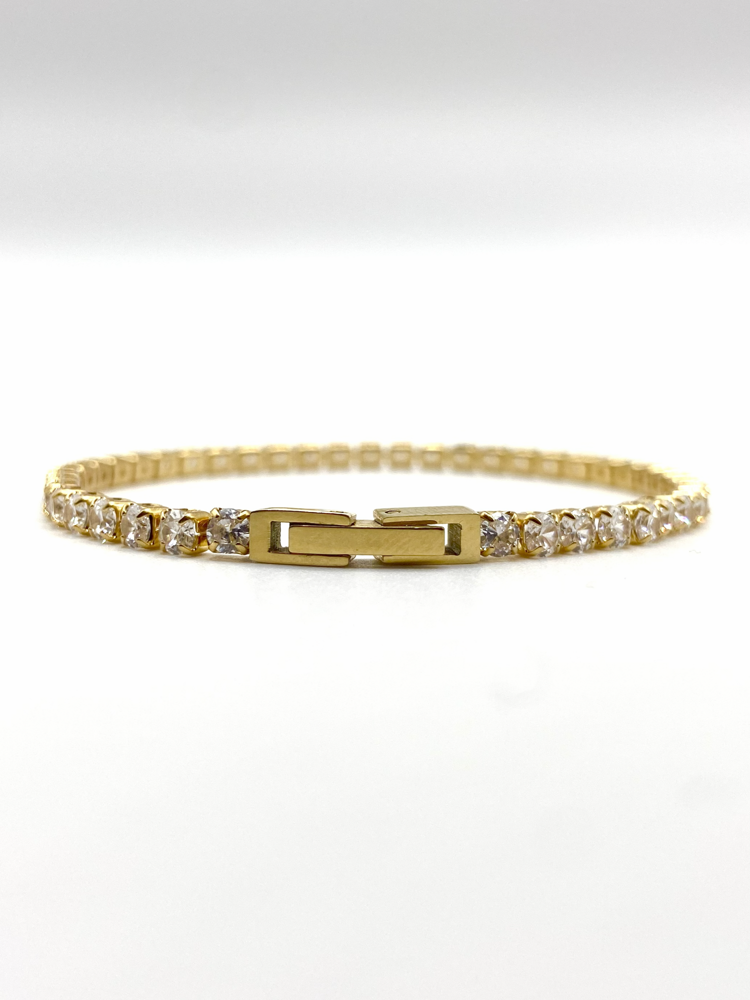 A finely crafted bracelet, plated in radiant 18K gold and set with precision-cut AAA cubic zirconia for a quiet shimmer. Crafted from resilient stainless steel, it’s built to endure daily wear.