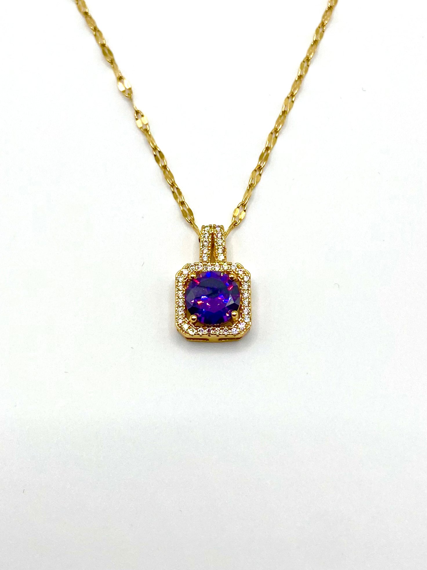 This Zircon pendant is inspired by the deep purple hue of “Obsidian.” It is encrusted with delicate micro CZ gems for extra sparkle. The pendant hangs freely on an 18K gold-plated stainless steel chain with an adjustable. This design is for a regal statement with grace.